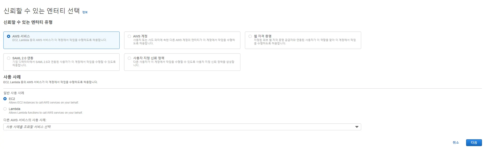 IAM 페이지에서 역할을 선택하고 역할 만들기를 눌러서 일반 사용 사례에서 EC2 선택 후 다음 진행합니다.