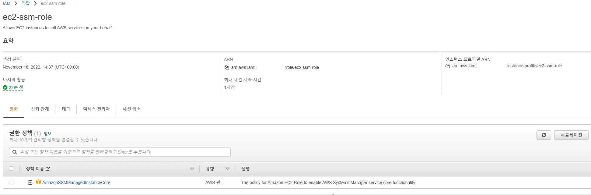 생성된 역할을 확인해 보면 아래 내용처럼 들어가 있습니다.