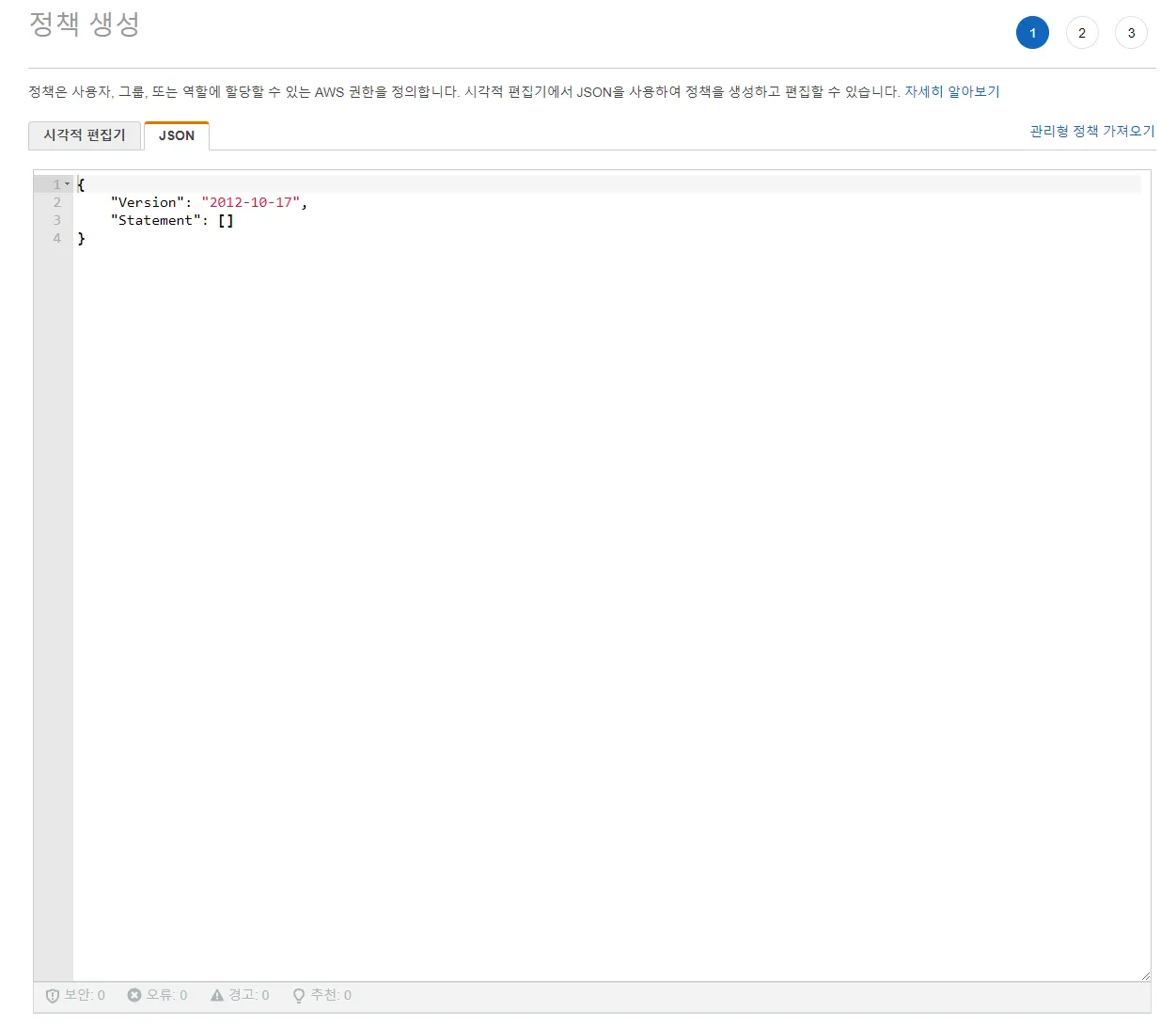 아래의 내용을 정책 생성(JSON)에 복사하고 정책을 생성 진행 합니다.