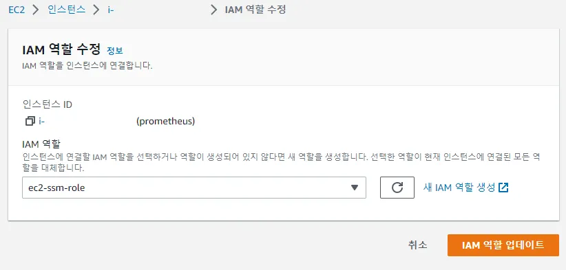 이제 ec2-ssm-role 역할을 할당할 EC2를 선택하고 실제 터미널에서 접속이 가능한지 확인해 보겠습니다.