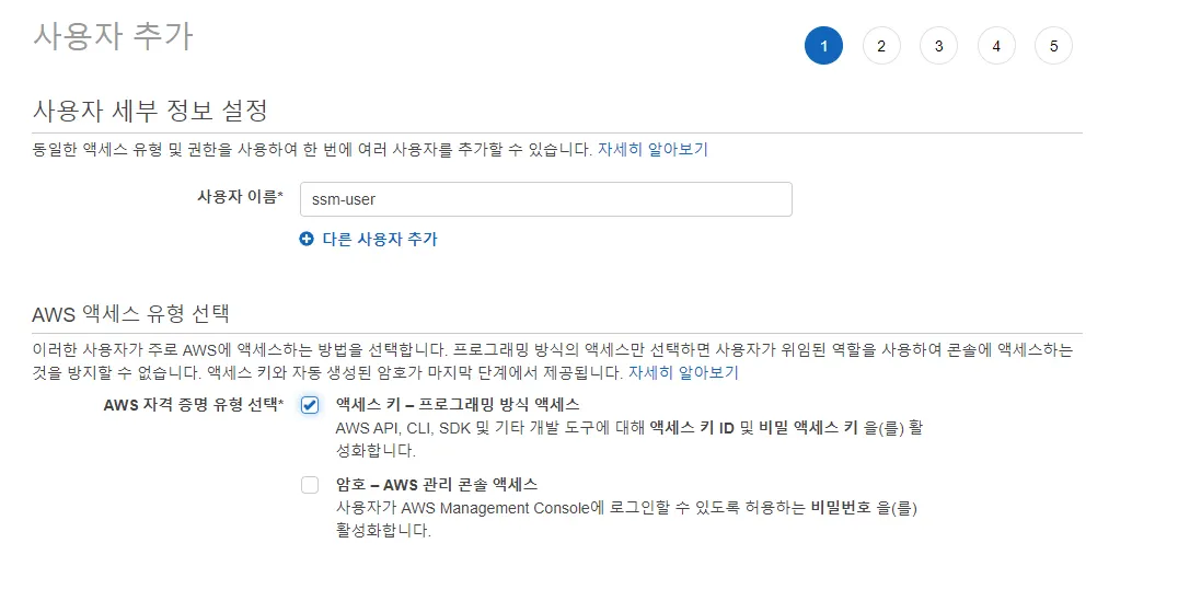 사용자 이름은 사용할 user 이름으로 작성하고 AWS 자격 증명 유형은 “액세스 키” 방식으로 나중에 터미널에서 aws configure 명령을 통해서 등록할 key 정보를 확인합니다.
