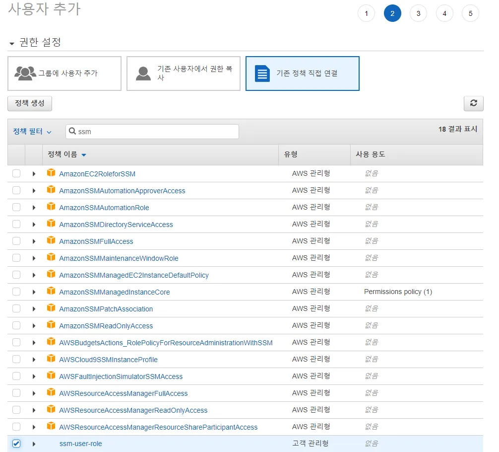 정책이 생성된 이후에 다시 사용자 추가 과정을 진행해서 마무리하면 됩니다. 위에서 생성한 정책을 선택하고 다음 진행합니다.
