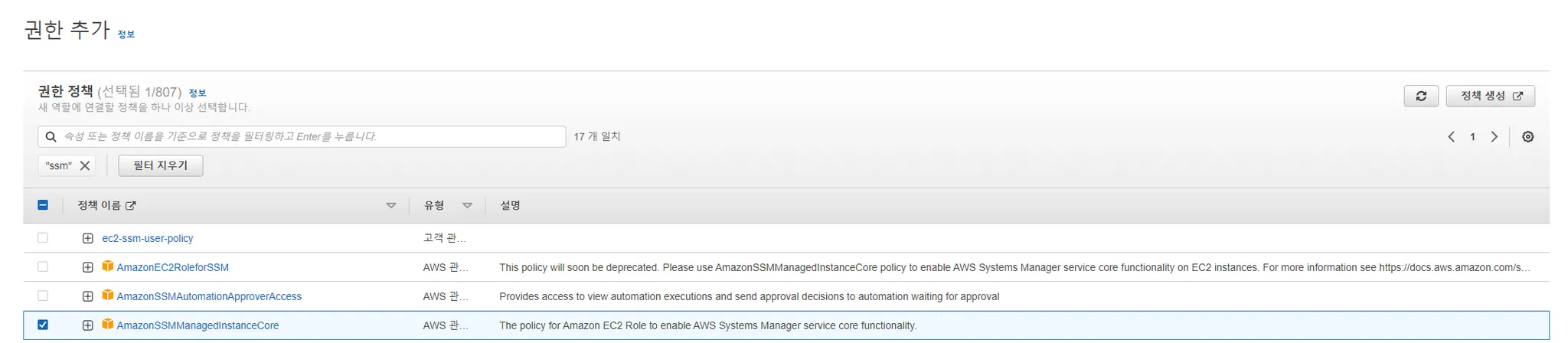 위에서 이야기 한 AmazonSSMManagedInstanceCore 권한을 선택하고 다음 진행합니다.