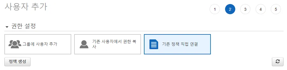 기존 정책 직접 연결을 선택 하고 “정책 생성” 버튼을 눌러서 JSON 형태로 권한을 부여하도록 하겠습니다.