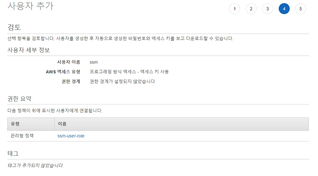 ssm 사용자에 추가될 권한을 확인하고 사용자 만들기 버튼을 눌러서 완료합니다.