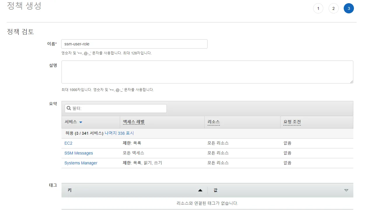 최종 정책 검토 단계에서 이름을 지정하고 “정책 생성” 버튼을 누르면 사용자에 할당할 정책이 생성됩니다.