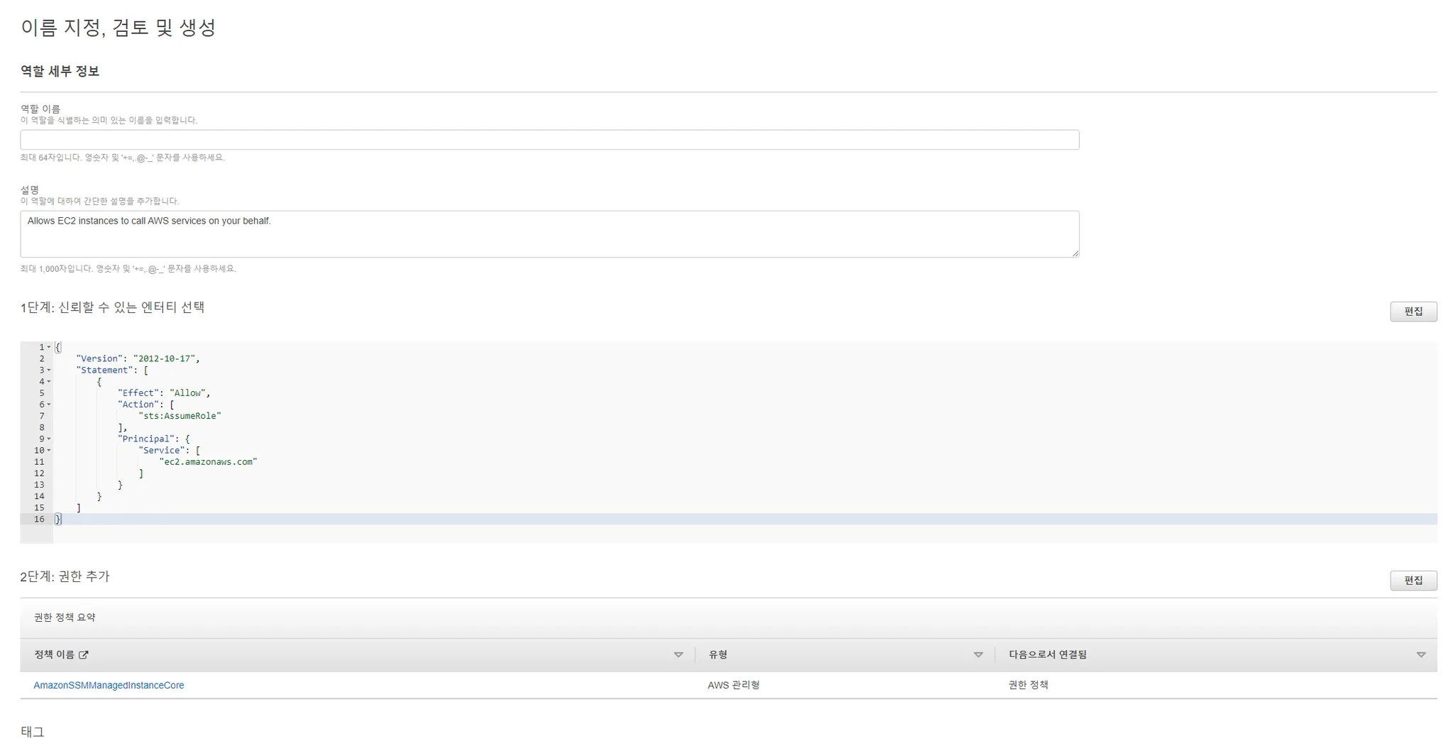 이름 지정, 검토 및 생성 페이지에서 EC2에 할당할 역할 이름을 지정하고 역할 생성을 진행합니다.
