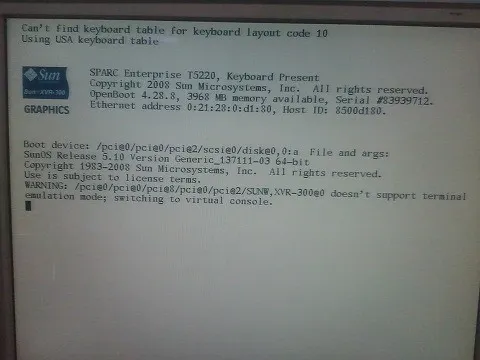 consconfig_dacf: [ID 508074 kern.warning] WARNING: /pci@7c0/pci@0/pci@8/SUNW,XVR-300@0 doesn't support terminal emulation mode; switching to virtual console.