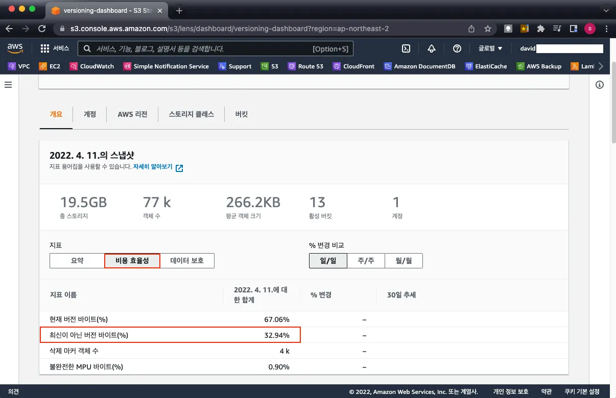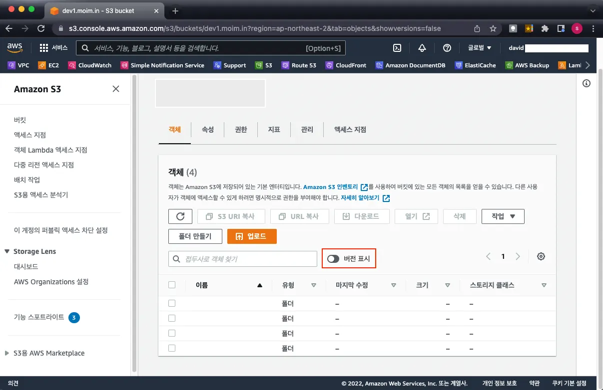 이쯤 되면 내가 관리하고 있는 버킷에 "버전 표시" 기능이 활성화되어 있는지 되어 있다면 어느 정도 용량을