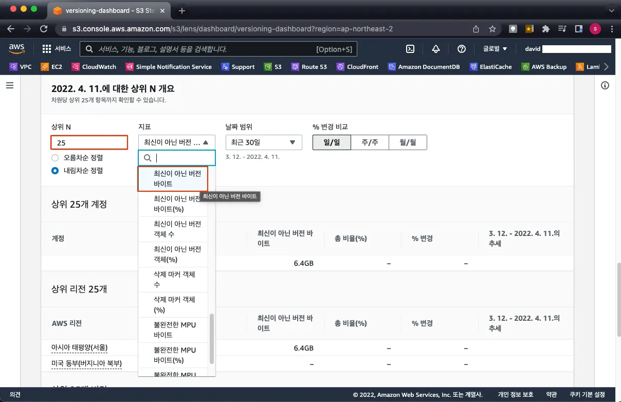 어느 버킷에서 얼마만큼 사용하는지 확인하기 위해 상위 N(기본값 3개)을 25개로 변경하고 지표에서 "최신이 아닌 버전 바이트" 를 선택하여 진행했습니다.