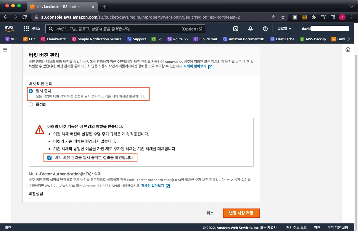 버킷 버전 관리는 "활성화" 또는 "일시 중지"만 가능하고 일시 중지를 위해서는 주의사항에 체크박스를 체크하고