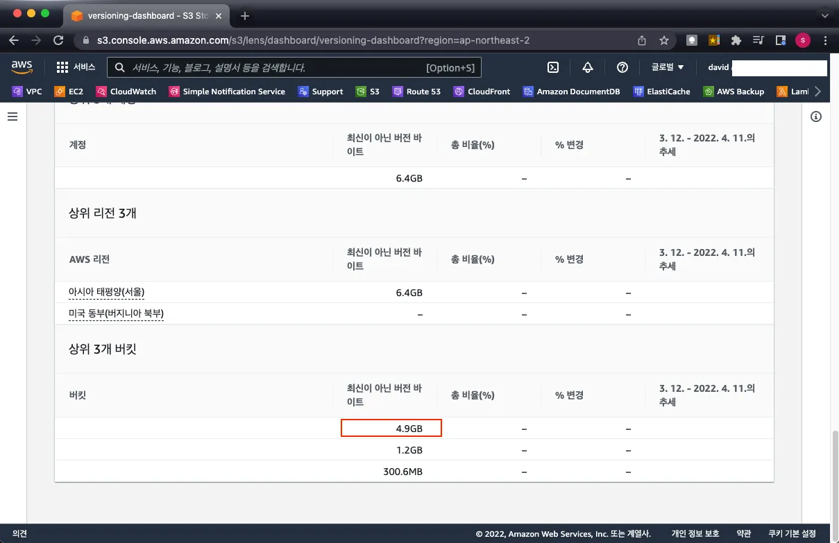 확인해 보니 "버전 기능"을 사용하여 여러 개의 객체(파일)이 존재하는 버킷 중 가장 큰 사이즈는 4.9GB를 차지하고 있었습니다.