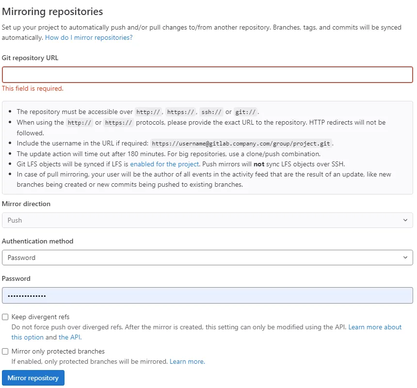 Gitlab → Project → Settings → Repository 페이지에서 미러링 기능을 활성화할 수 있습니다.