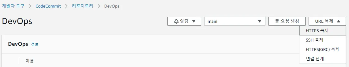 이제 다시 CodeCommit Repository URL 복제 버튼을 눌러서 HTTPS 복제 버튼을 누르면 URL을 복사하고 gitlab에서 연결하겠습니다.