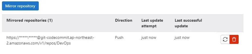 저희는 CodeCommit에 이관을 하기 위한 작업으로 해당 기능을 사용해서 최종적으로 gitlab과 CodeCommit repository mirroing 구성을 했고 구성을 끄기 전까지는 지속적으로 Sync가 됩니다.