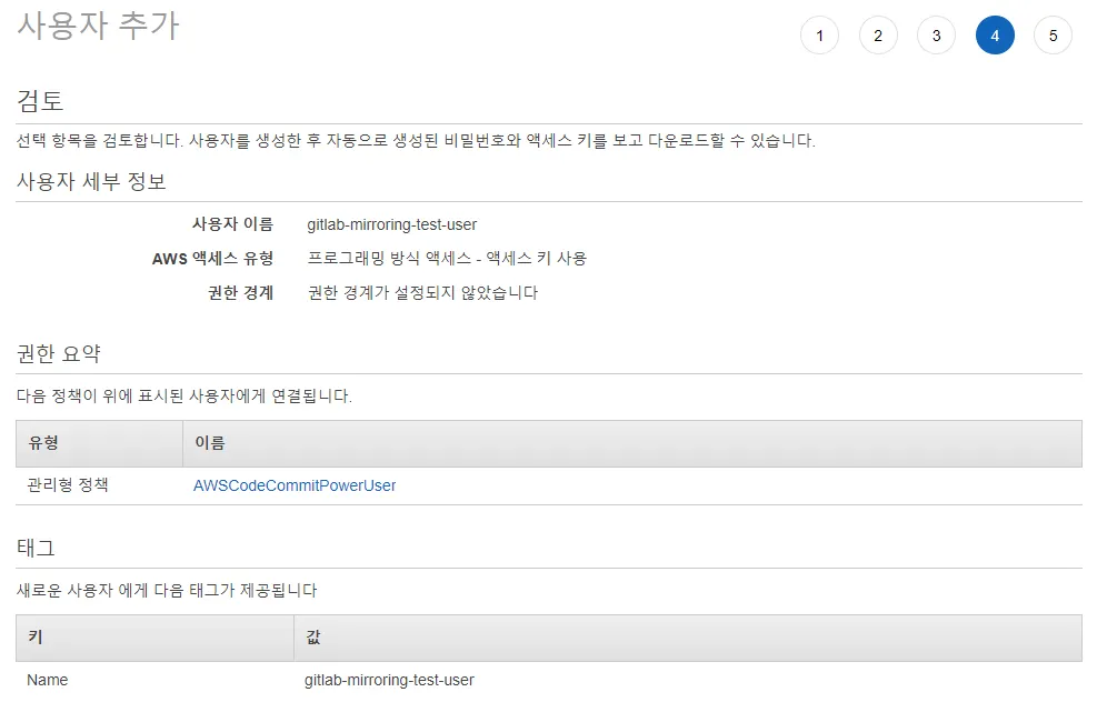 사용자 추가에 필요한 권한은 “기존 정책 직접 연결”에서 codecommit 검색 후 “AWSCodeCommitPowerUser” 권한을 선택하고 추가합니다.