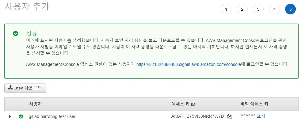 생성된 사용자의 액세스 키 ID와 비밀 액세스 키는 콘솔에서 1회 성으로 보이기 때문에 .csv 다운로드를 통해서 영구적으로 보관이 필요한 내용입니다.