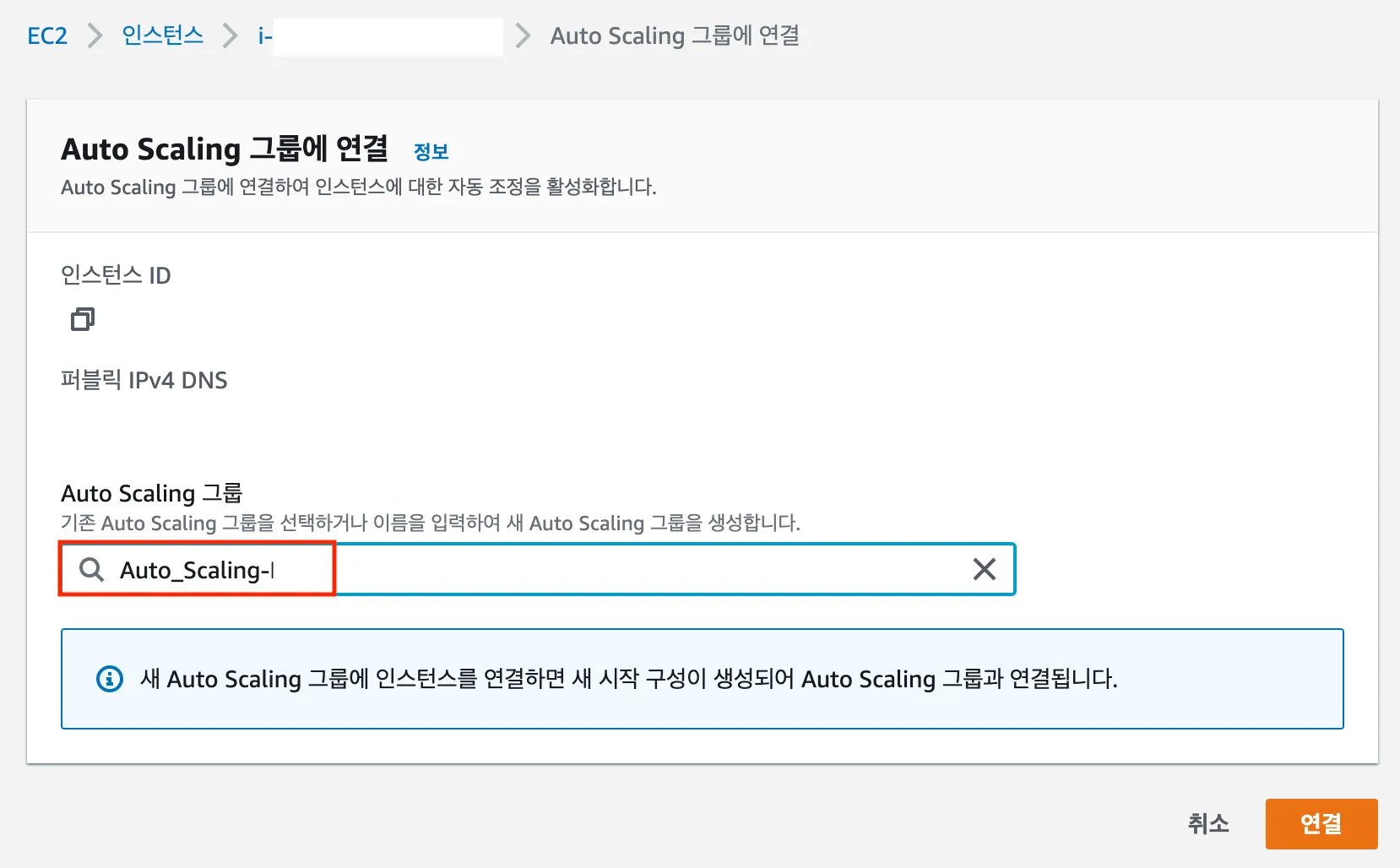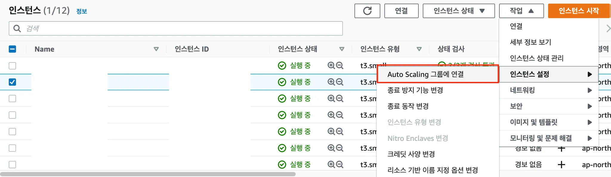 인스턴스 → EC2 선택 → 작업 → 인스턴스 실행 → Auto Scaling 그룹에 연결합니다.