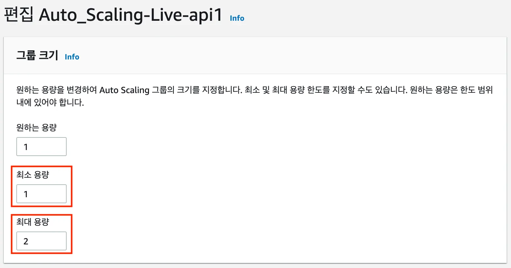 그룹 크기에서 인스턴스 최소 용량 및 최대 용량을 선택합니다.