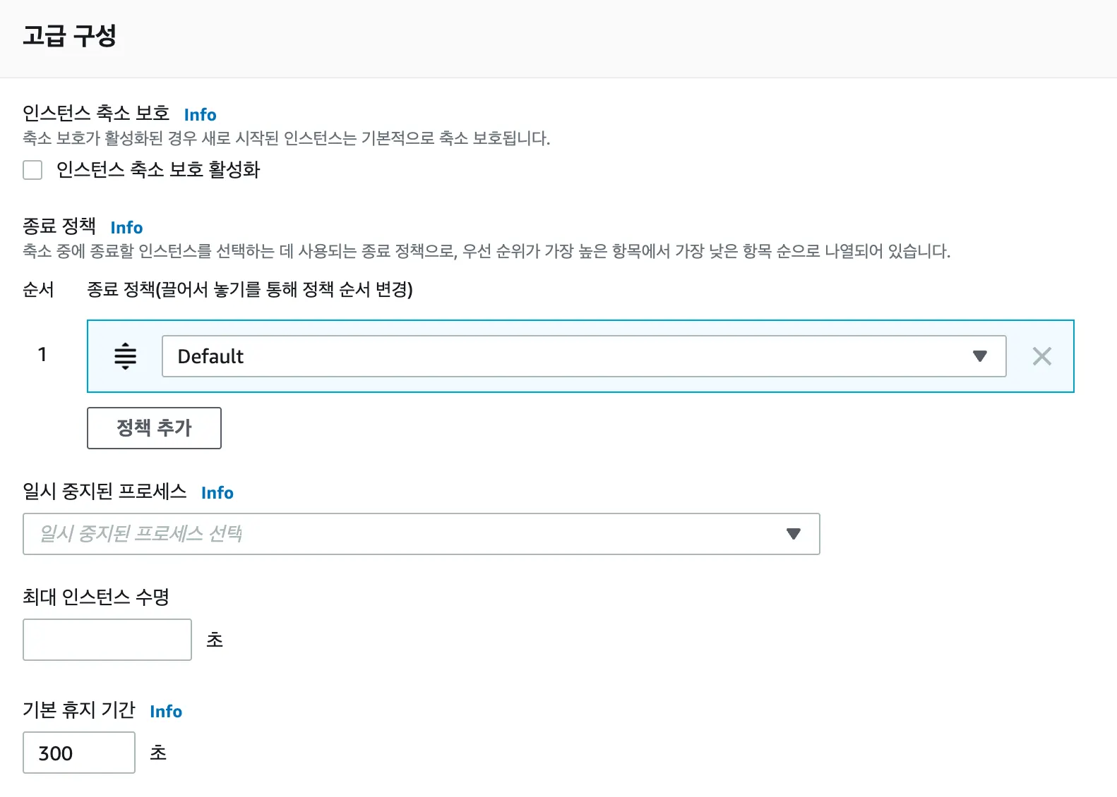 고급 구성은 기본 값으로 설정했다. 만약 인스턴스 축소 보호 활성화를 체크할 경우 지표 유형의 대상 값보다 낮아지면 인스턴스가 삭제되는데 이때 보호할 수 있습니다.
