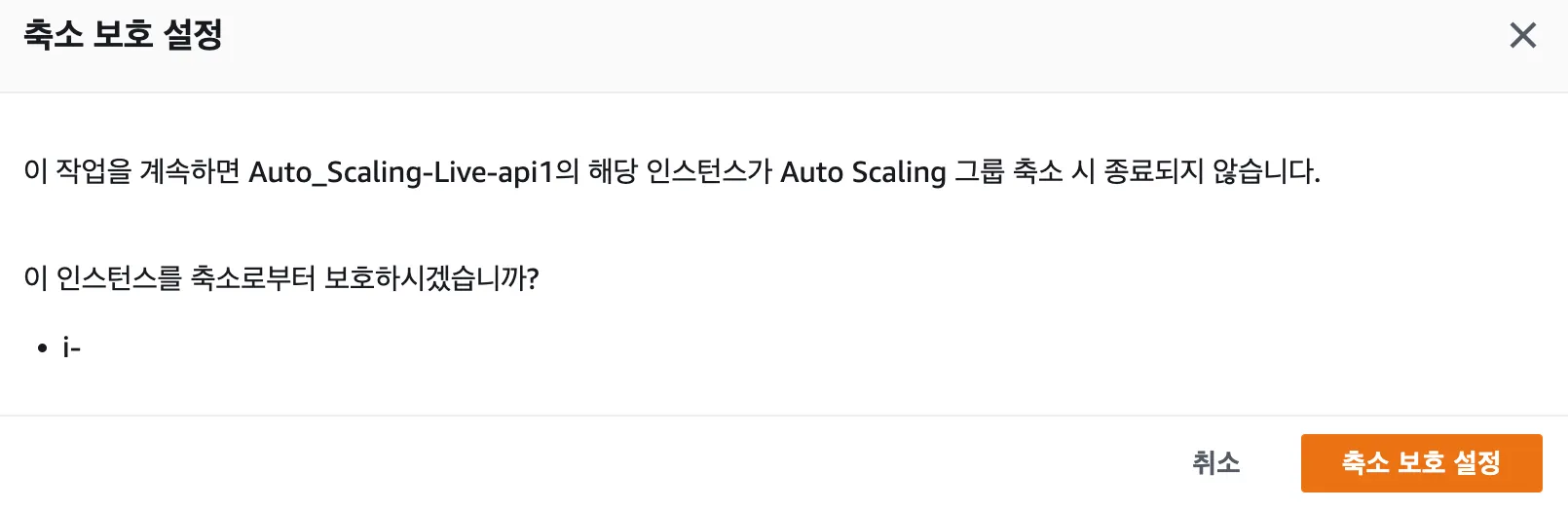 축소 보호 설정 버튼을 누르면 해당 인스턴스는 동적 크기 조정 정책에 의해서 Scale In 정책에 의해 줄어들 때 보호받을 수 있습니다.