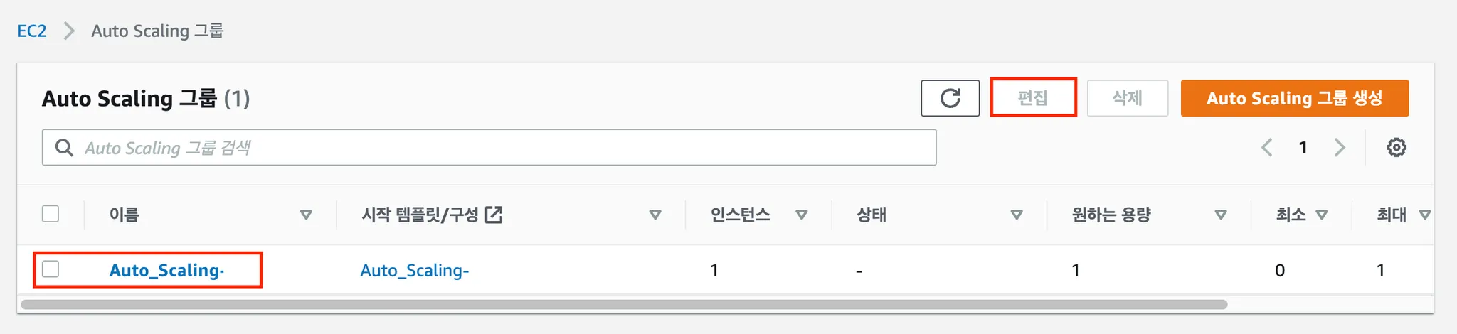 위에서 생성한 Auto Scaling Group을 선택 후 ‘편집' 클릭