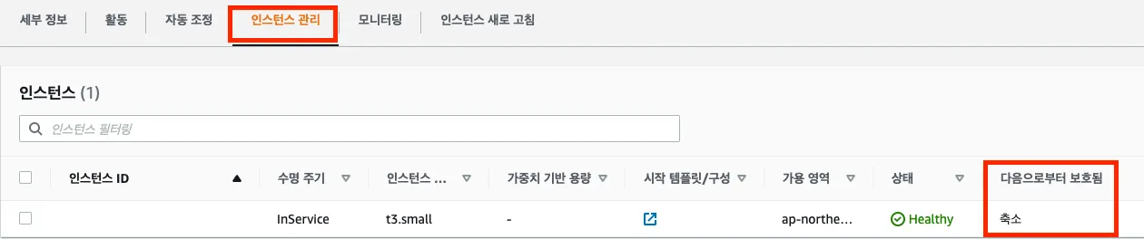 인스턴스 관리 → 추가된 인스턴스 선택 후 작업을 누르면 ‘인스턴스 축소 보호 설정’ 을 할 수 있습니다.