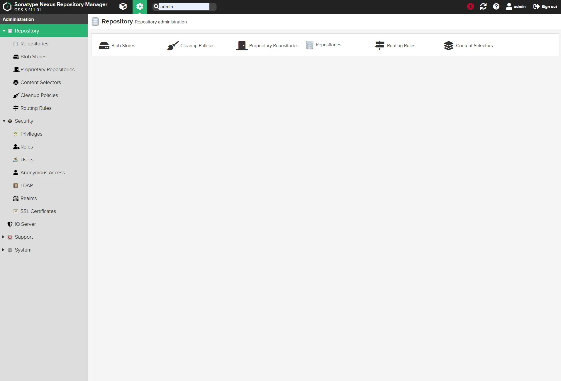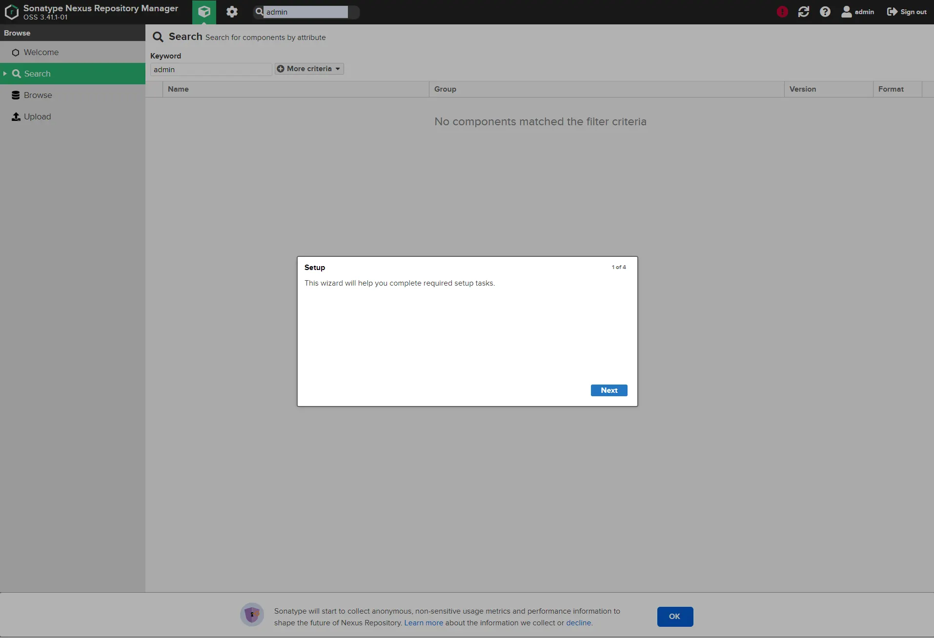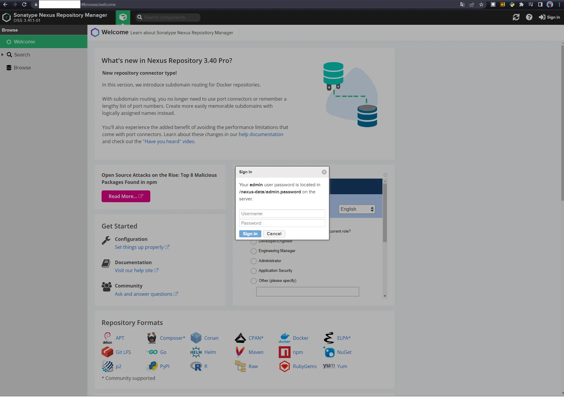 Sign in을 하기 위해서 버튼을 누르면 ID는 admin이지만 초기 패스워드는 도커로 구성한 내부에서 /nexus-data/admin.password 파일에서 확인이 가능합니다.