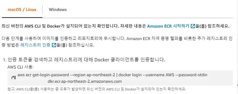 이제 ECR에서 이미지를 Pull 하기 위해서 명령어를 ECR에 들어가서 확인해 볼 수 있습니다.