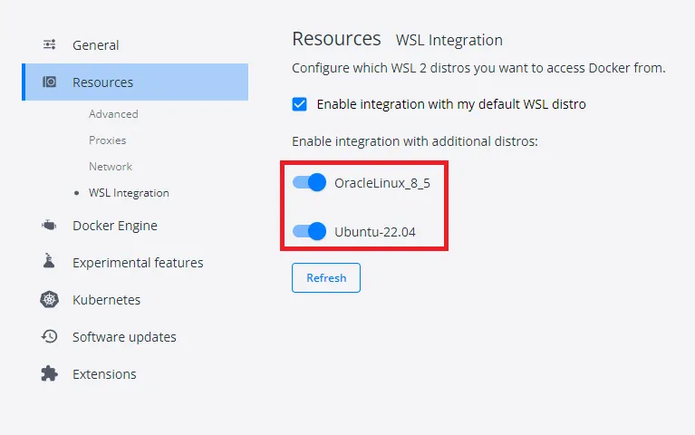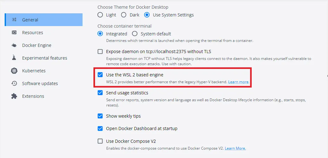 CLI 환경에서 직접 Docker를 설치하지 않았다면 Docker Desktop에서 “Use the WSL 2 based engine” 활성화를 통해서 구성할 수 있습니다.