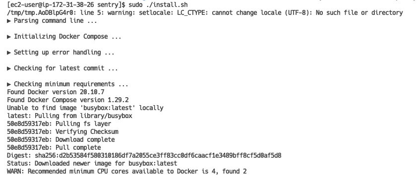 현재 EC2 Type은 T3.large 인데 (vCPU : 2, MEM : 8GB) 가장 하단에 Docker에서 4 vCPU가 필요하다고 메시지가 발생하지만 설치는 가능합니다.