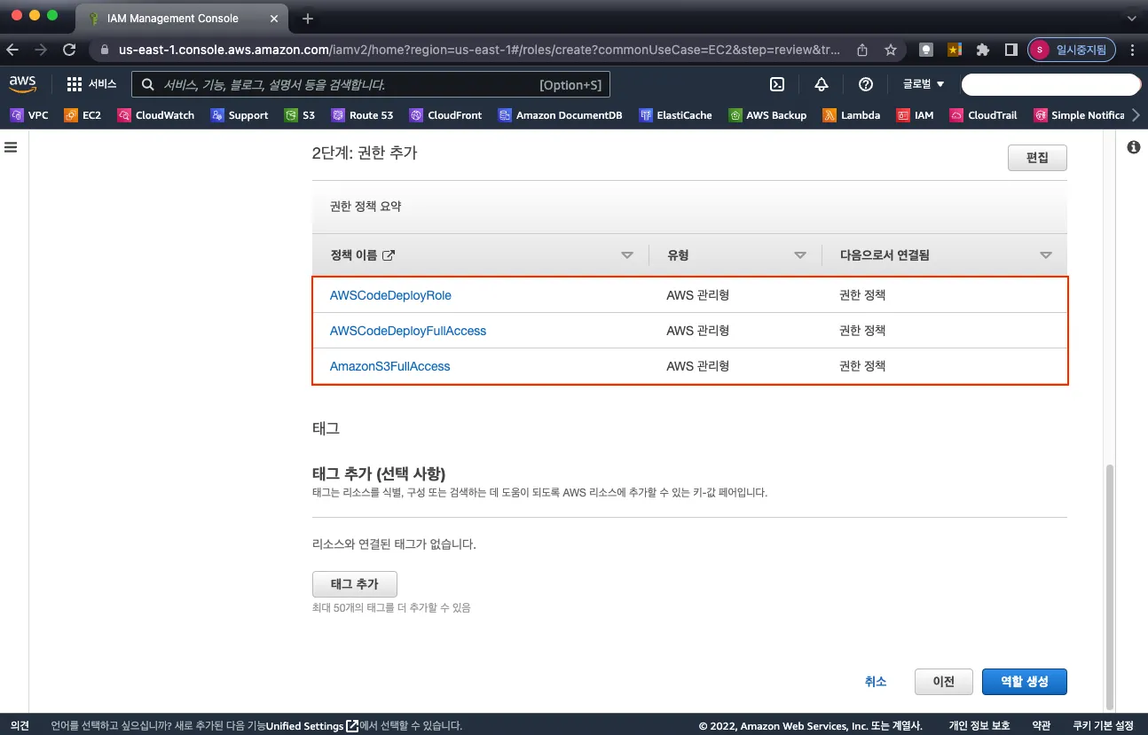 역할 세부 정보에 역할 이름을 작성하고 2단계 권한 추가에는 앞서 추가한 정책들이 들어가 있는 것을