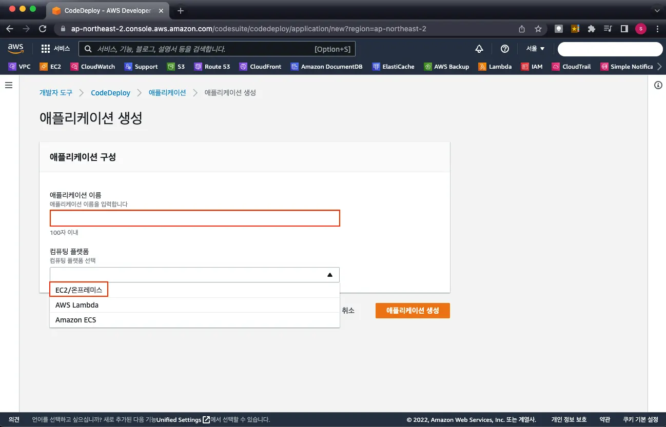 Application 이름을 작성하고 컴퓨팅 플랫폼에서는 배포 대상 서버가 EC2 또는 물리적인 온프레미스인 경우