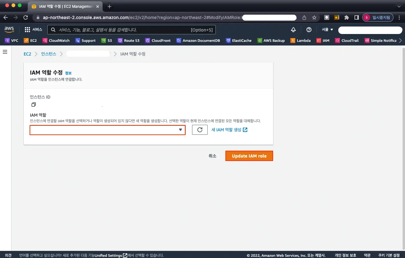 선택하면 앞서 생성한 역할을 선택하고 Update IAM Role 버튼으로 적용할 수 있습니다.