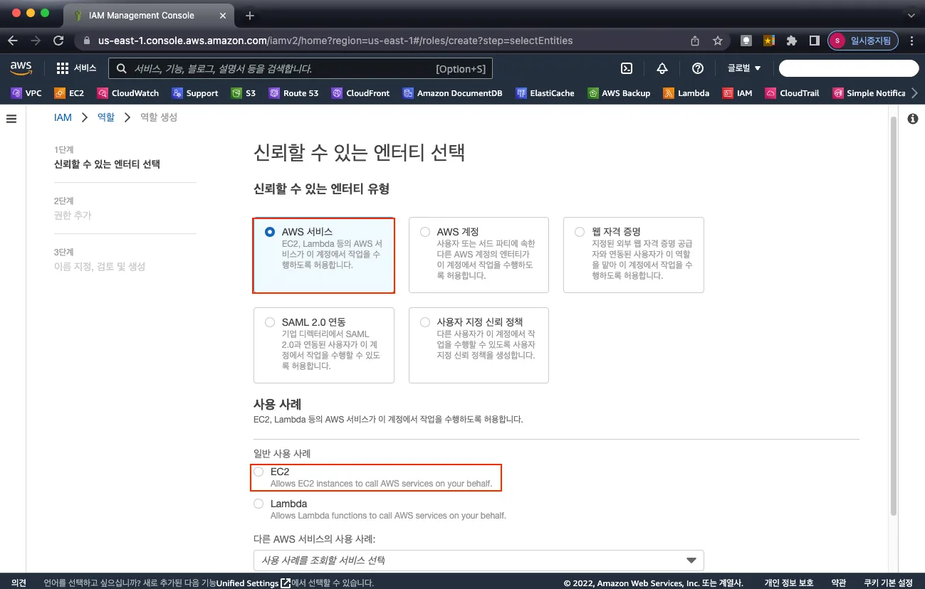 신뢰할 수 있는 엔터티 선택에서 AWS 서비스를 선택하고 일반 사용 사례에서 EC2를 선택합니다.